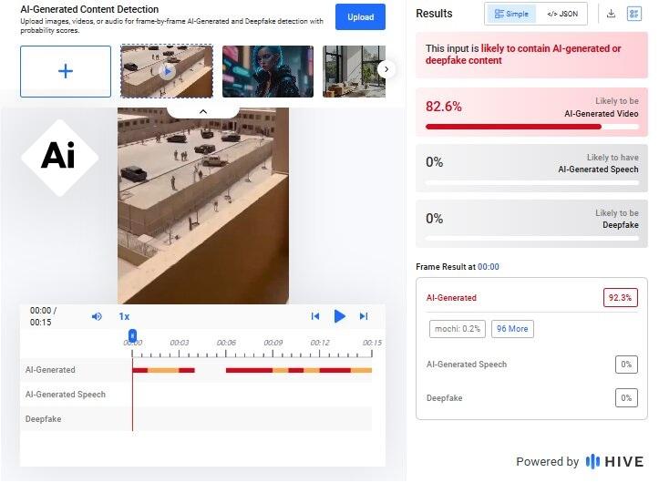 Al introducir el vídeo en la herramienta de detección de generación digital Hive Moderation, dio como resultado un 82% de probabilidad de que las imágenes hubieran sido creadas con IA.