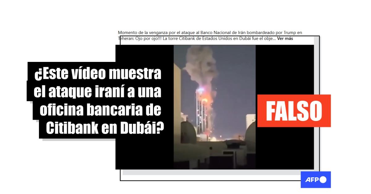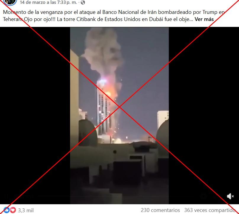 Un vídeo compartido en redes sociales muestra el instante de una explosión en un edificio. Lo acompaña un mensaje en Facebook: “Momento de la venganza por el ataque al Banco Nacional de Irán bombardeado por Trump en Teheran: Ojo por ojo!!! La torre Citibank de Estados Unidos en Dubái fue el objetivo del misil iraní”.