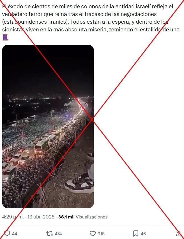 “El éxodo de cientos de miles de colonos de la entidad israelí refleja el verdadero terror que reina tras el fracaso de las negociaciones (estadounidenses-iraníes)”, se lee en una publicación en X junto con el video viral donde se ve una carretera llena de gente y vehículos.