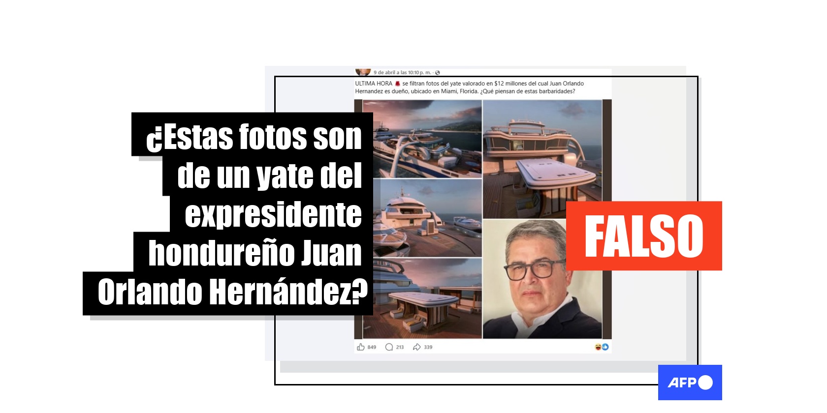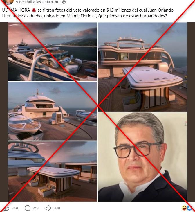 “ULTIMA HORA se filtran fotos del yate valorado en $12 millones del cual Juan Orlando Hernandez es dueño, ubicado en Miami, Florida”, se lee en publicaciones compuestas por cuatro imágenes de un navío y la foto del expresidente en Facebook (1, 2) e Instagram.