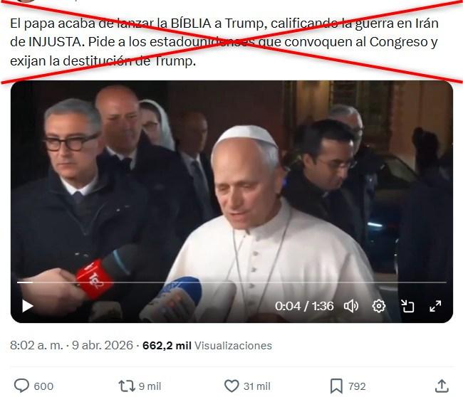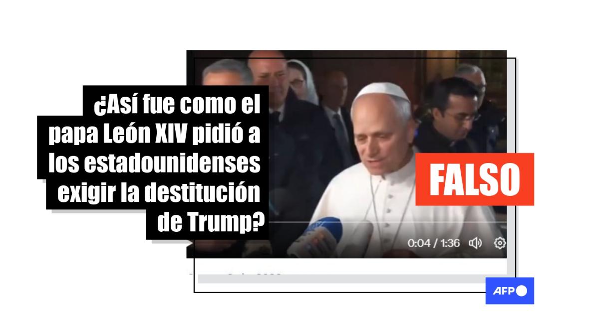 Desde enero de 2026, el Vaticano ha emitido declaraciones de preocupación sobre las acciones estadounidenses en países extranjeros, lo que ha generado tensiones. En este escenario, desde el 9 de abril, usuarios en redes sociales han compartido más de 10.000 veces un video en el que aparece el papa León XIV respondiendo preguntas de la prensa en inglés, con la afirmación de que pidió a los estadounidenses que exijan la destitución del presidente Donald Trump. Pero es falso, el pontífice nunca mencionó lo que afirman las entradas.