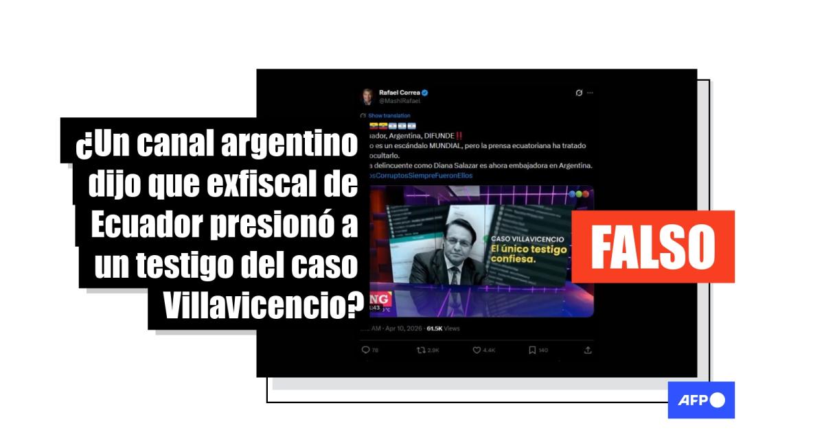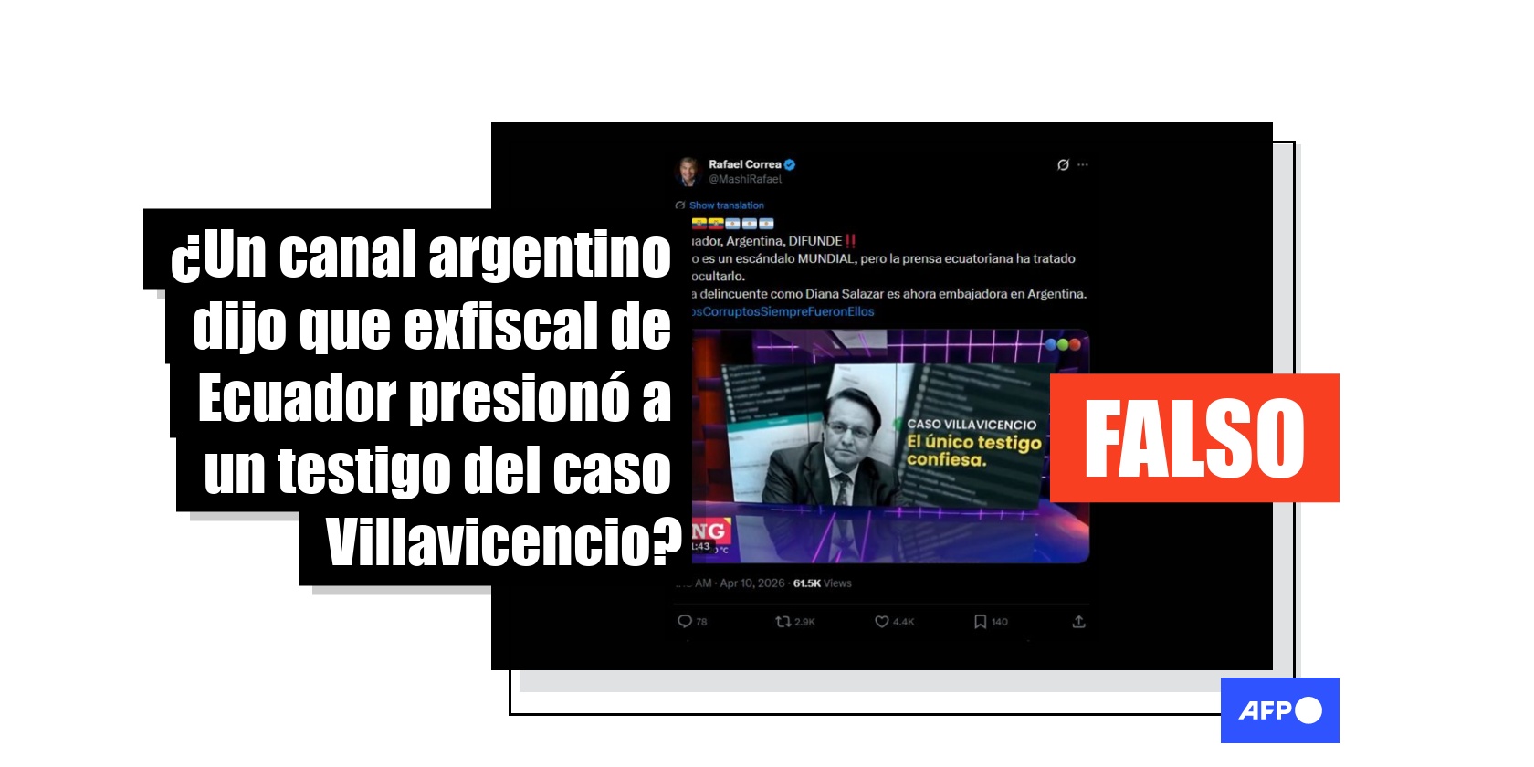 Ecuador anunció el 1 de abril de 2026 la captura de José Patricio Aguas Muñoz, alias Cholú, uno de los cabecillas de la banda narco “Los lobos”, vinculada al asesinato del candidato presidencial Fernando Villavicencio en 2023. En ese contexto, se ha compartido más de 6.000 veces en redes sociales un supuesto informe de un noticiero argentino que asegura que la exfiscal general de Ecuador, Diana Salazar, presionó a Aguas Muñoz para culpar del magnicidio al correísmo, corriente del expresidente Rafael Correa (2007-2017). Pero el supuesto noticiero es un montaje hecho con inteligencia artificial.