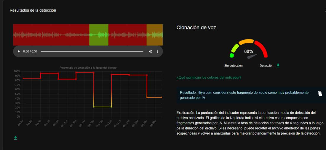 Un análisis del audio del video con la herramienta de detección de IA de InVID-WeVerify arrojó un 88% de probabilidad de que haya sido generado artificialmente.