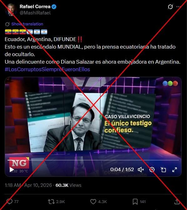 El video fue difundido en X por Correa, junto al mensaje: “Ecuador, Argentina, DIFUNDE. Esto es un escándalo MUNDIAL, pero la prensa ecuatoriana ha tratado de ocultarlo. Una delincuente como Diana Salazar es ahora embajadora en Argentina”.