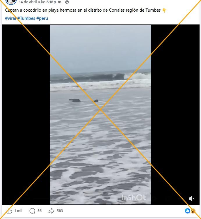 El cocodrilo de Tumbes, una especie en peligro de extinción, habita en el norte de Perú, en las cuencas de los ríos Tumbes y Zarumilla. Desde el 14 de abril de 2026 circula en redes sociales un video que muestra a un ejemplar de la especie supuestamente en la Playa Hermosa, el borde costero de la región de Tumbes. Sin embargo, la secuencia, que se ha compartido más de 2.000 veces, se difunde en línea al menos desde 2017, asociada a Costa Rica.