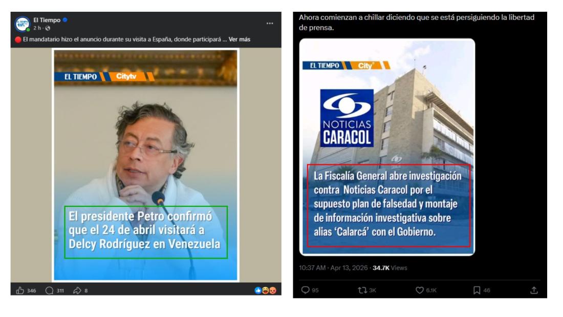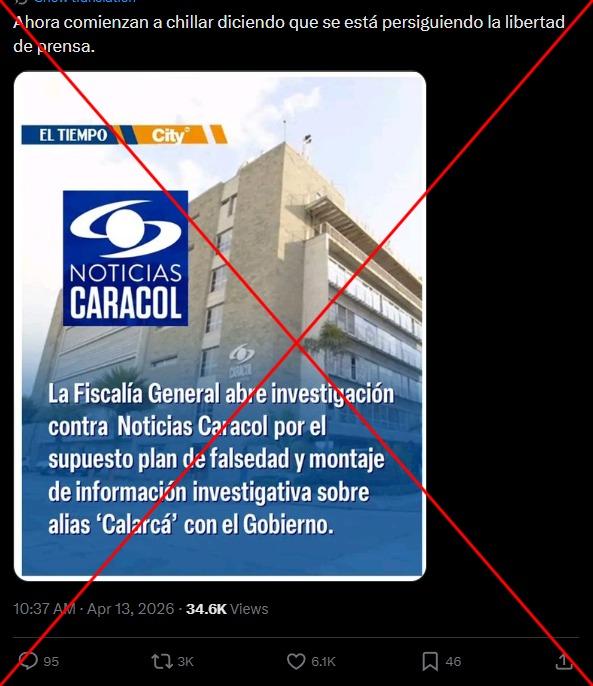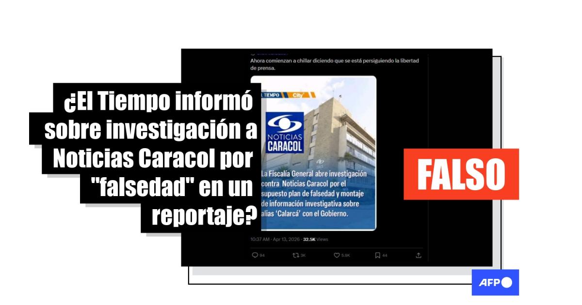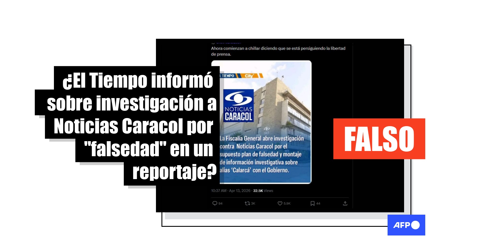 El 31 de marzo de 2026, el jefe de la inteligencia en Colombia, Wilmar Mejía, anunció su renuncia, cuatro meses después de que una investigación de Noticias Caracol revelara conversaciones entre él y una disidencia de las extintas FARC, bajo el mando de alias Calarcá. Desde el 12 de abril, se ha compartido más de 3.000 veces en redes sociales una supuesta placa del diario El Tiempo informando que la fiscalía investiga a ese noticiero por “falsedad” en el reportaje. Pero el contenido viral es un montaje y las autoridades confirmaron la autenticidad de los documentos citados por el medio.