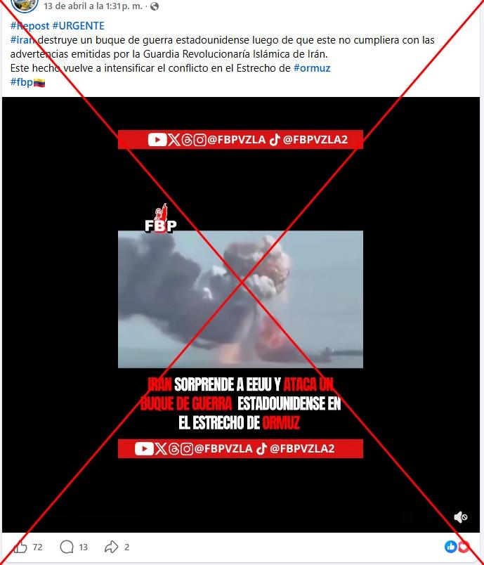 A mediados de abril de 2026, Estados Unidos anunció un bloqueo para barcos iraníes en el estrecho de Ormuz, a modo de forzar a la república islámica a abrir el paso marítimo. En este contexto, desde el 13 del mismo mes se ha compartido más de 1.700 veces en redes sociales un video que mostraría el momento en que Irán ataca un buque de guerra estadounidense. Sin embargo, la secuencia corresponde a un ataque de EE.UU. a un navío de combate iraní en marzo de 2026.