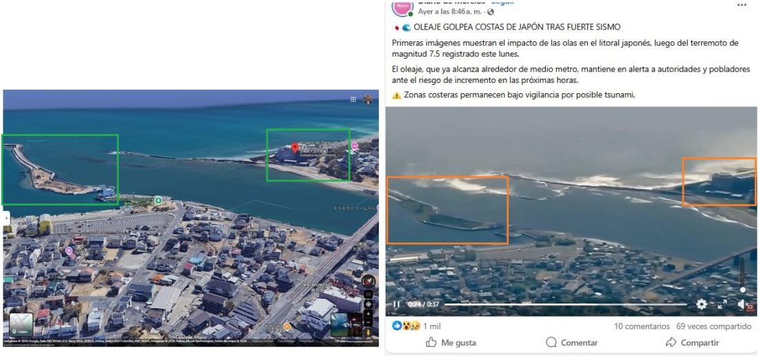 Una búsqueda inversa en Google con uno de los fotogramas permitió encontrar la misma grabación, publicada el 30 de julio de 2025, por el medio de comunicación Metro TV Malaysia. Según la descripción, se trata de las olas de un tsunami de hasta cuatro metros de altura que se extendieron por el Pacífico, luego del terremoto en Rusia.
