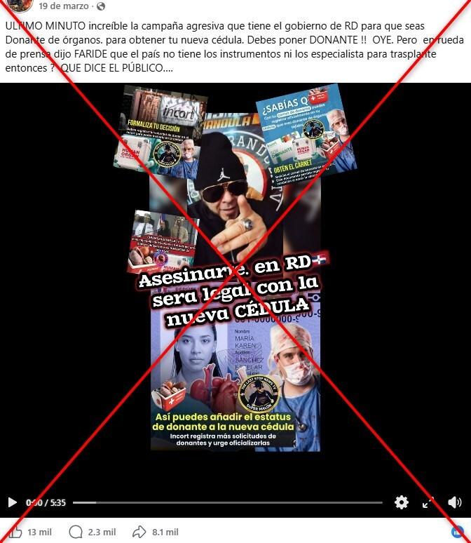 “ULTIMO MINUTO increíble la campaña agresiva que tiene el gobierno de RD [República Dominicana] para que seas Donante de órganos. para obtener tu nueva cédula. Debes poner DONANATE!! OYE. Pero en rueda de prensa dijo FARIDE [la ministra de Interior y Policía] que el país no tiene los instrumentos ni los especialista para trasplante entonces ? QUE DICE EL PÚBLICO…. ”, señala una publicación en Facebook que incluye un video cuyo titular dice: “Asesinarte en RD sera legal con la nueva CÉDULA”.