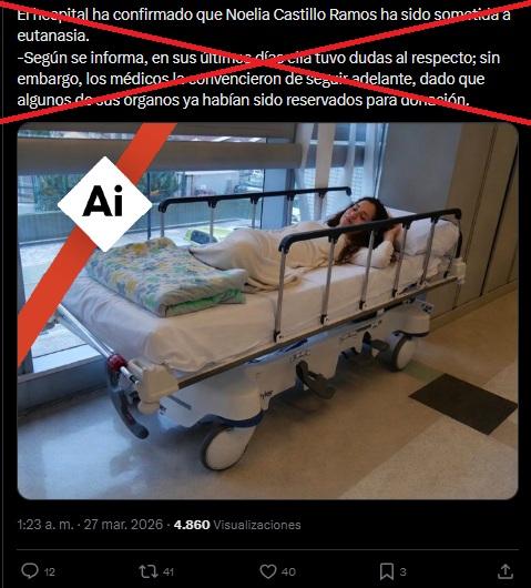 El fallecimiento de la española Noelia Castillo, quien recibió la eutanasia en marzo de 2026, tras un litigio judicial, motivó la difusión de desinformación sobre la joven y el procedimiento de prestación de la ayuda a morir. Un ejemplo es una imagen compartida cerca de 500 veces que supuestamente muestra a Noelia en una cama de hospital con los ojos cerrados. Sin embargo, se trata de una ilustración creada con inteligencia artificial (IA) a partir de una foto de un hospital en Hong Kong, procedente de Wikipedia.