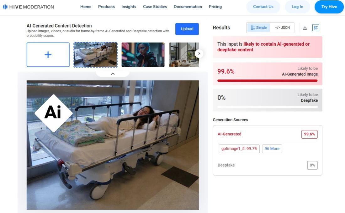 Al introducir la imagen viral en detectores de imágenes sintéticas como AI or NOT o Hive Moderation, estas herramientas señalan una alta probabilidad de que la imagen ha sido creada con IA. En concreto, Hive Moderation estima una probabilidad del 99,6%.