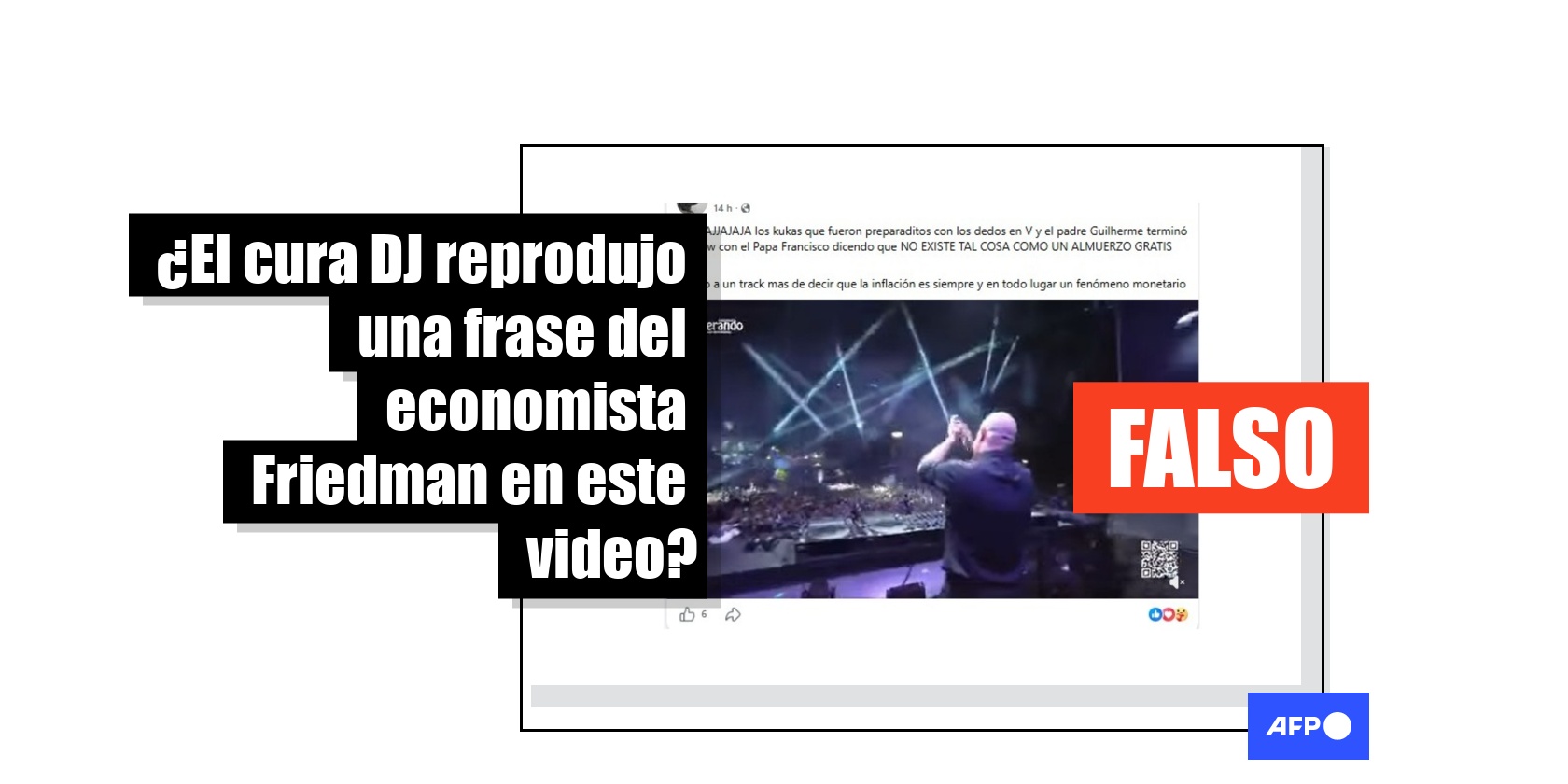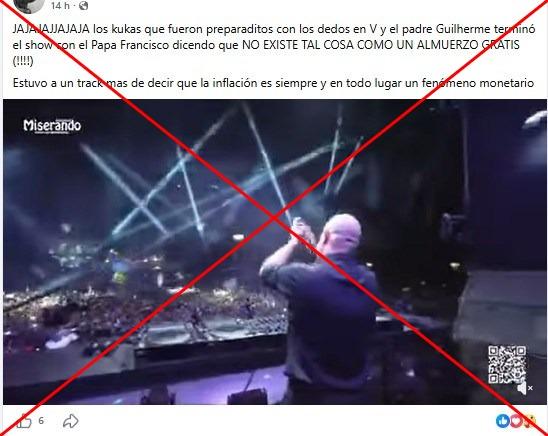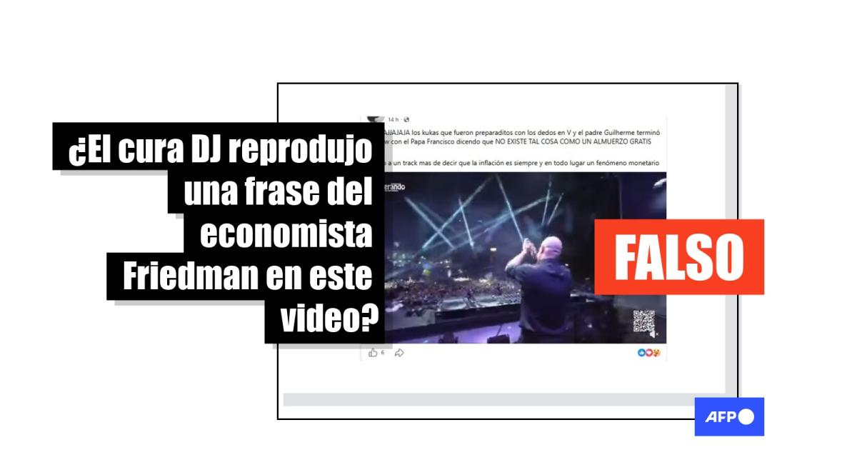 El sacerdote portugués Guilherme Peixoto, conocido como el cura DJ, ofreció el 18 de abril de 2026 una presentación de música electrónica en Buenos Aires, en la que incorporó frases emblemáticas del papa Francisco. Desde entonces, circula en redes sociales un video del concierto junto con la afirmación de que Peixoto reprodujo una frase del economista estadounidense Milton Friedman: “No existe tal cosa como un almuerzo gratis”. Pero en el metraje, compartido más de 1.000 veces, nunca se escucha esa frase, sino dichos del pontífice fallecido sobre el amor de Jesús.