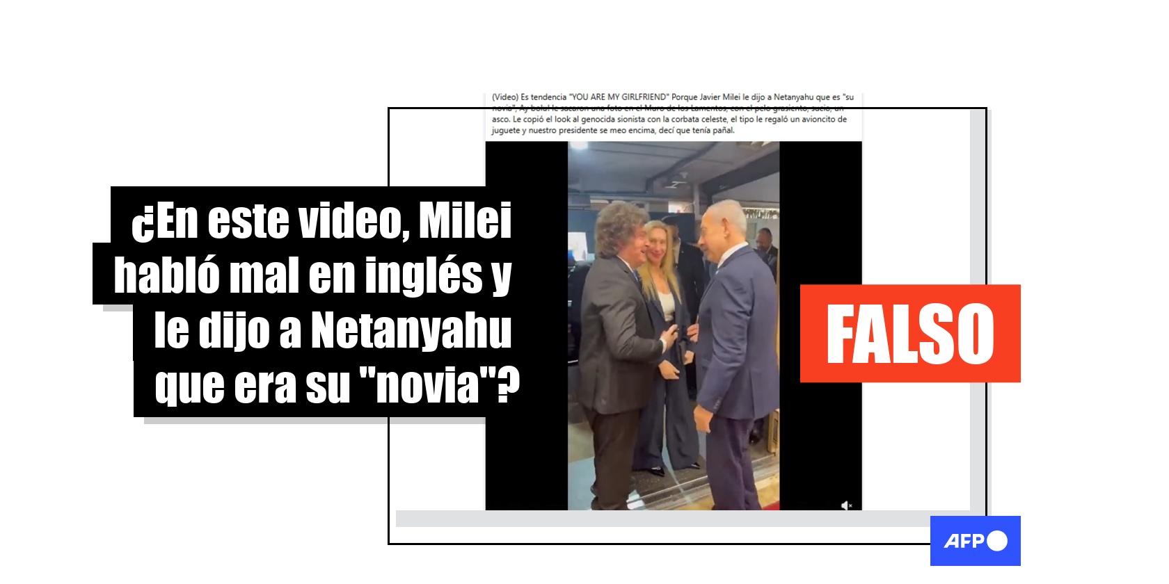 El primer ministro de Israel, Benjamin Netanyahu, recibió el 19 de abril de 2026 la visita del presidente de Argentina, Javier Milei. A raíz de ese encuentro, circula un video del momento en que Milei saluda en inglés a su homólgo, junto con textos que afirman que supuestamente habló mal el idioma y le dijo a Netanyahu “eres mi novia”. Pero es falso. En la grabación, compartida más de 1.000 veces en redes sociales, en realidad se escucha que Milei dice: “Eres mi más querido amigo”.