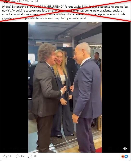 “#Papelon Javier Milei le dijo al Primer MInistro de Israél que es: Su novia Claramente el ingles del presidente no es el mejor”, se lee en una publicación en Instagram junto con el video viral, también compartido en X.