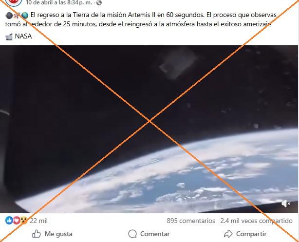 “El regreso a la Tierra de la misión Artemis II en 60 segundos. El proceso que observas tomó alrededor de 25 minutos, desde el reingresó a la atmósfera hasta el exitoso amerizaje”, señala un video en Facebook que también ha sido divulgado en X, Instagram y TikTok.