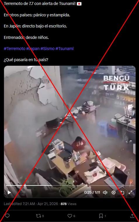 “Terremoto de 7.7 con alerta de Tsunami! En otros países: pánico y estampida. En Japón: directo bajo el escritorio. Entrenados desde niños”, dice una de las publicaciones compartidas en Facebook (1, 2) Instagram (1, 2), TikTok y X.