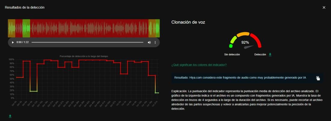 AFP Factual analizó el audio del contenido viral con la herramienta Hiya de InVID-WeVerify, que detecta clonaciones de voz, y dio como resultado un 92% de probabilidad de que habría sido creado con inteligencia artificial.