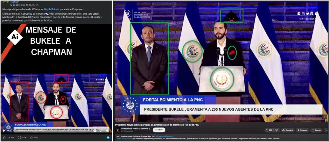 Una búsqueda inversa de los fotogramas clave de la secuencia condujo a una transmisión de la Secretaría de Prensa de El Salvador, difundida el 4 de abril de 2022, en la que el presidente Bukele juramentó a nuevos agentes de la Policía Nacional Civil.