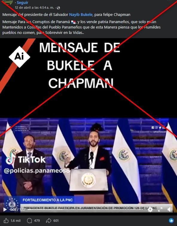 “Mensaje del presidente de él Salvador Nayib Bukele, para felipe Chapman”, señala una publicación en Facebook, en la cual el mandatario da un discurso durante un evento oficial.