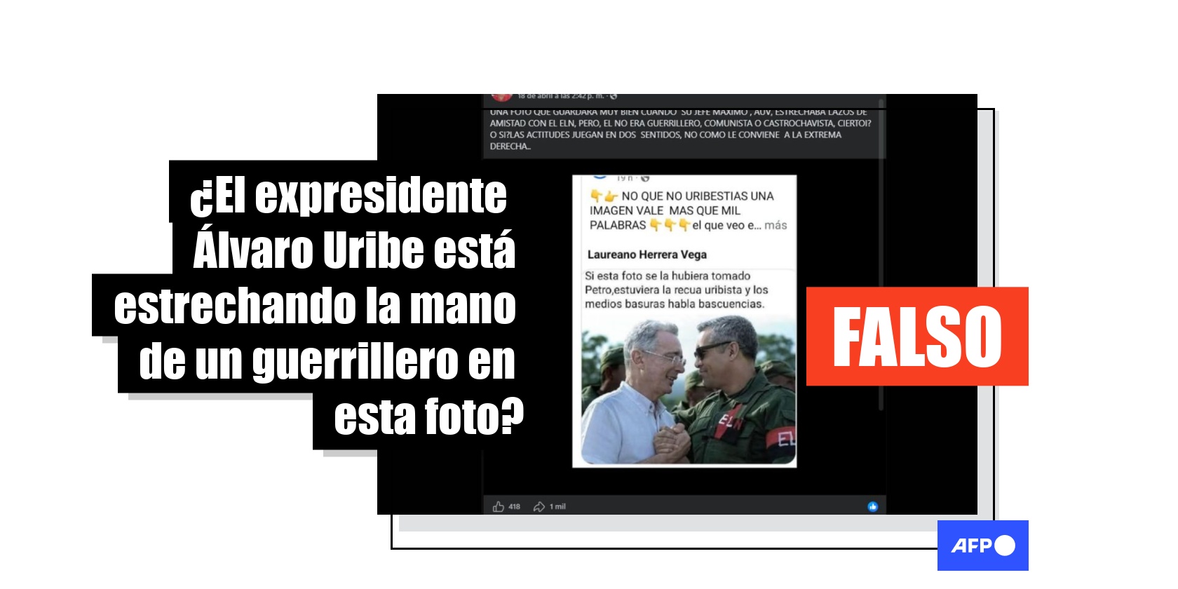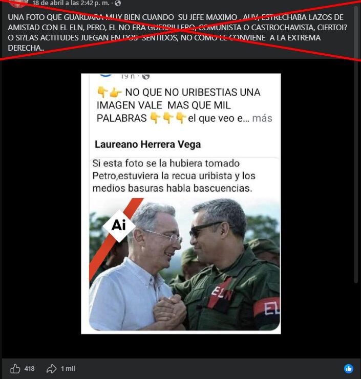 “UNA FOTO QUE GUARDADA MUY BIEN CUANDO SU JEFE MÁXIMO , AUV, ESTRECHABA LAZOS DE AMISTAD CON EL ELN, PERO, EL NO ERA GUERRILLERO, COMUNISTA O CASTROCHAVISTA, CIERTO? O SI? LAS ACTITUDES JUEGAN EN DOS SENTIDOS, NO COMO LE CONVIENE A LA EXTREMA DERECHA”, dice una de las publicaciones que comparte la foto en Facebook (1, 2), X y TikTok.