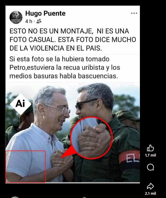 La escena viral presenta inconsistencias gráficas que apuntan al uso de IA. Por ejemplo, el supuesto miembro del grupo armado tiene seis dedos y el brazo de Uribe parece que no tuviera codo.