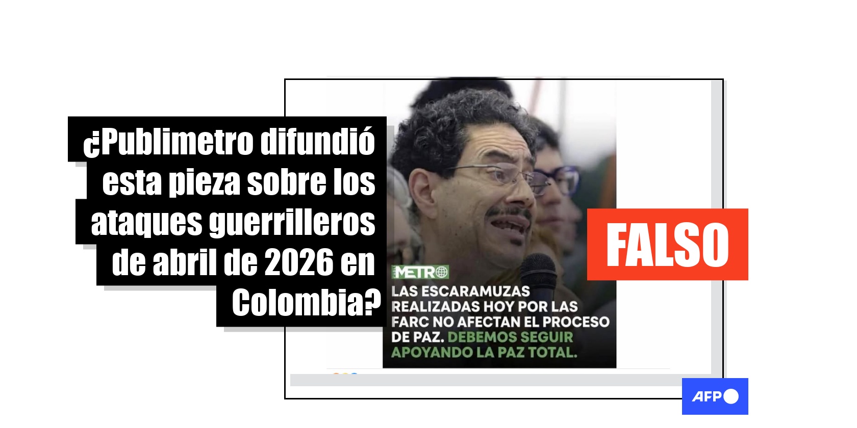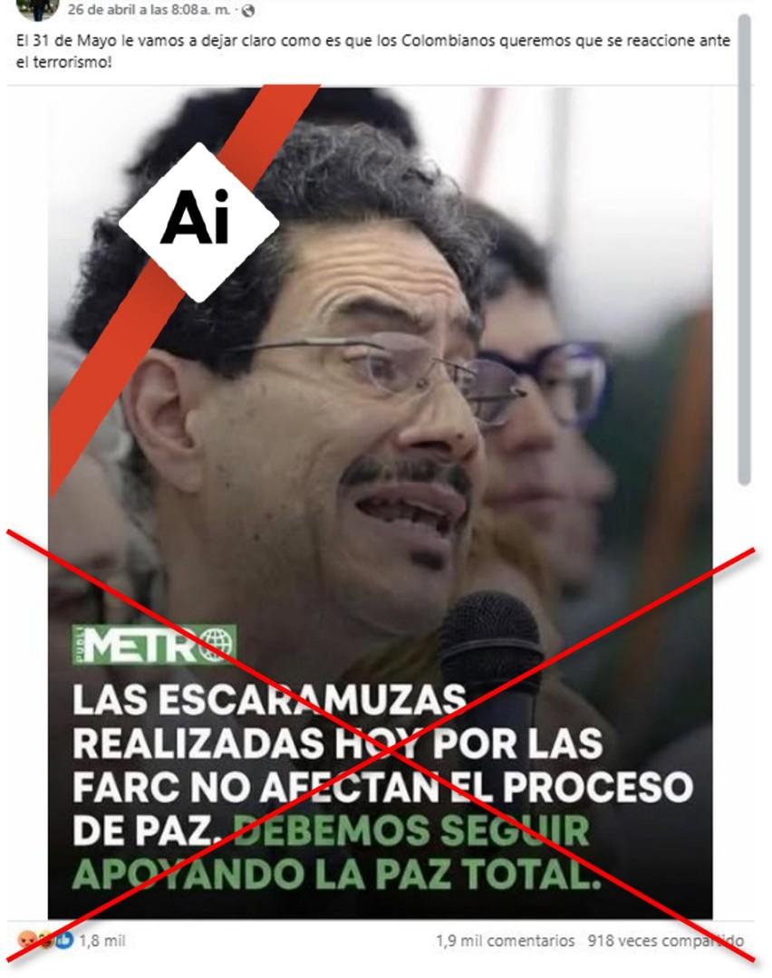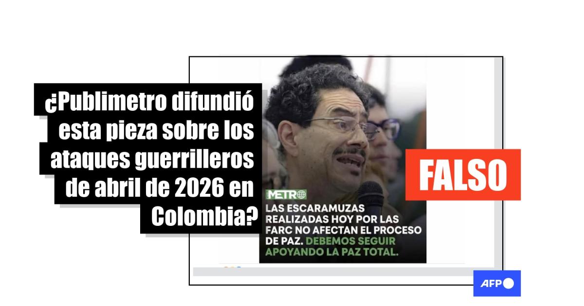 En el suroccidente de Colombia se registraron más de 30 ataques guerrilleros el último fin de semana de abril de 2026, en plena campaña presidencial. En medio de esta situación, circuló en redes sociales una placa adjudicada al medio Publimetro en la que el senador y candidato oficialista, Iván Cepeda, rebaja los atentados a “escaramuzas” de las extintas FARC. La imagen fue compartida más de 3.000 veces; sin embargo, se trata de un montaje que presenta indicios de haber sido creado con inteligencia artificial. Además, no hay registros de que el candidato haya hecho tal declaración.