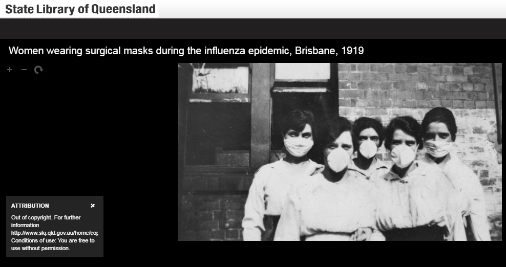 La publicación viral incluye una imagen de unas mujeres usando tapabocas. Una búsqueda inversa de la foto en los motores de Google y Yandex ubica la foto en la biblioteca estatal John Oxley de Queensland, en el noreste de Australia.