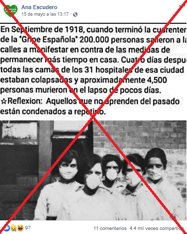 “En Septiembre de 1918, cuando terminó la cuarentena de la ‘Gripe Española’ 200.000 personas salieron a las calles a manifestar en contra de las medidas de permanecer más tiempo en casa. Cuatro días después todas las camas de los 31 hospitales de esa ciudad estaban colapsadas y aproximadamente 4,500 personas murieron en el lapso de pocos días. Reflexión: Aquellos que no aprenden del pasado están condenados a repetirlo (sic)”, dice el mensaje que se ha compartido en Facebook (1, 2) junto con la imagen.