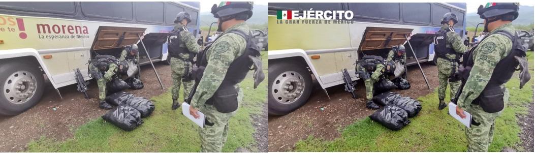 El 24 de junio de 2021, cerca de las 11H30 horas en el centro de México, la Sedena difundió en sus redes sociales (1, 2) las imágenes de la incautación de drogas en Apatzingán, Michoacán (oeste). En ellas se ve a militares sacando bolsas negras de un autobús, tomadas del lado izquierdo del vehículo, sin ningún logo político.