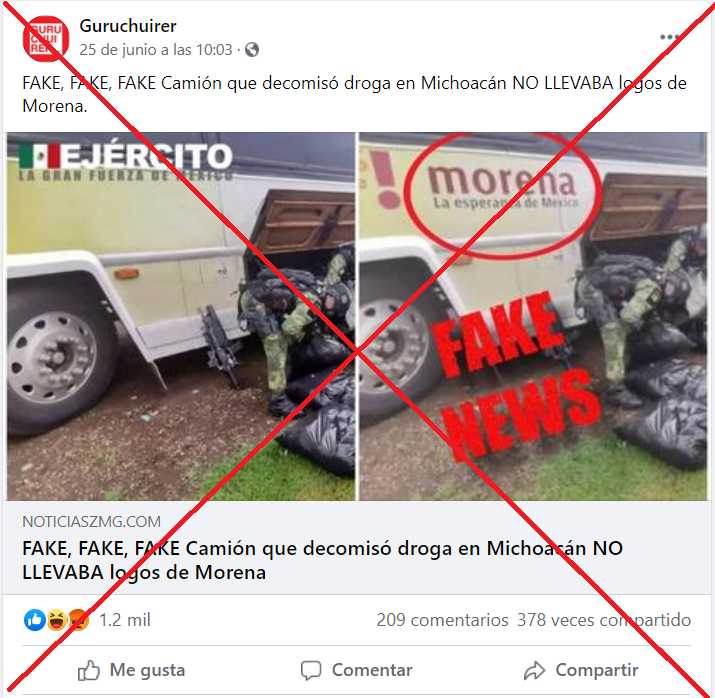 “FAKE, FAKE, FAKE Camión que decomisó droga en Michoacán NO LLEVABA logos de Morena”, señalaban otros usuarios en redes sociales (1, 2, 3) y en sitios (1), al apuntar que se trataría de un montaje.