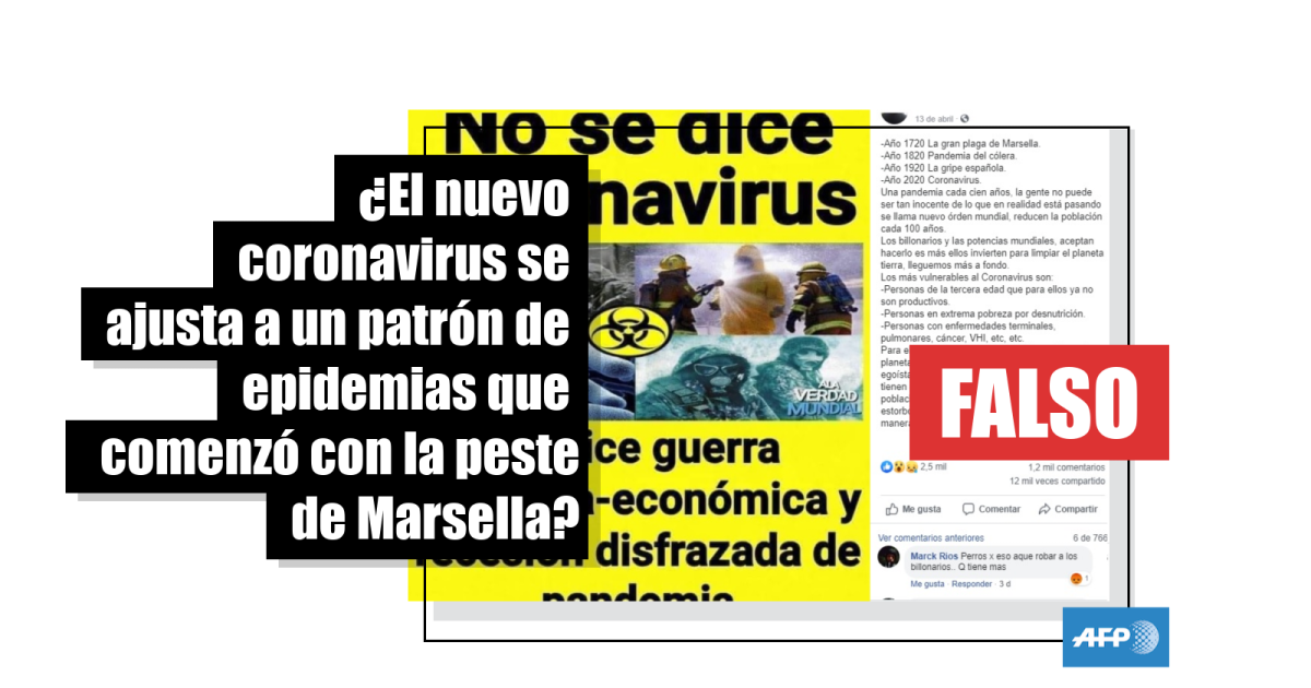"Año 1720 La gran plaga de Marsella. Año 1820 Pandemia del cólera. Año 1920 La gripe española. Año 2020 Coronavirus. Una pandemia cada cien años, la gente no puede ser tan inocente de lo que en realidad está pasando se llama nuevo orden mundial, reducen la población cada 100 años”, señalan varias publicaciones en Facebook (1, 2, 3, 4, 5) publicadas desde el 12 de abril pasado, que han sido compartidas más de 53.000 veces en total.