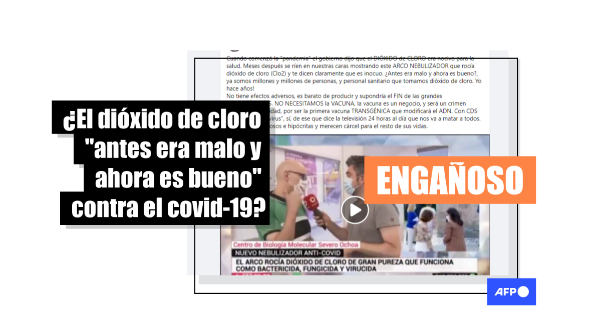 “El gobierno dijo que el dióxido de cloro era nocivo para la salud”, dice una publicación en Facebook del 6 de agosto, que explica que el vídeo de la noticia muestra un “arco nebulizador que esparce dióxido de cloro, y te dicen claramente que es inocuo. ¿Antes era malo y ahora es bueno?”, se pregunta el usuario, que afirma: “Ya somos millones y millones de personas (...) las que tomamos dióxido de cloro. No tiene efectos adversos”.