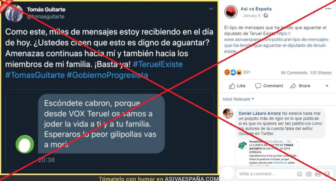 “Como este, miles de mensajes estoy recibiendo en el día de hoy. ¿Ustedes creen que esto es digno de aguantar? Amenazas continuas hacia mí y también hacia los miembros de mi familia. ¡Basta ya!”, dice un tuit compartido en Facebook, atribuido a la cuenta @tomasguitarte y que adjunta la captura de pantalla de un mensaje amenazante supuestamente del partido Vox.