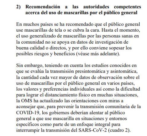 Sin embargo, las publicaciones viralizadas en redes sociales omitieron el párrafo que le sigue, en el que la OMS se señala que, teniendo en cuenta los estudios sobre la transmisión en pacientes presintomáticos y asintomáticos, los datos del uso de mascarillas en varios países, entre otros parámetros, “la OMS ha actualizado las orientaciones con miras a aconsejar que, para prevenir la transmisión comunitaria de la COVID-19, los gobiernos deberían alentar al público general a que use mascarilla en situaciones y entornos específicos como parte de un enfoque integral para interrumpir la transmisión del SARS-CoV-2”.