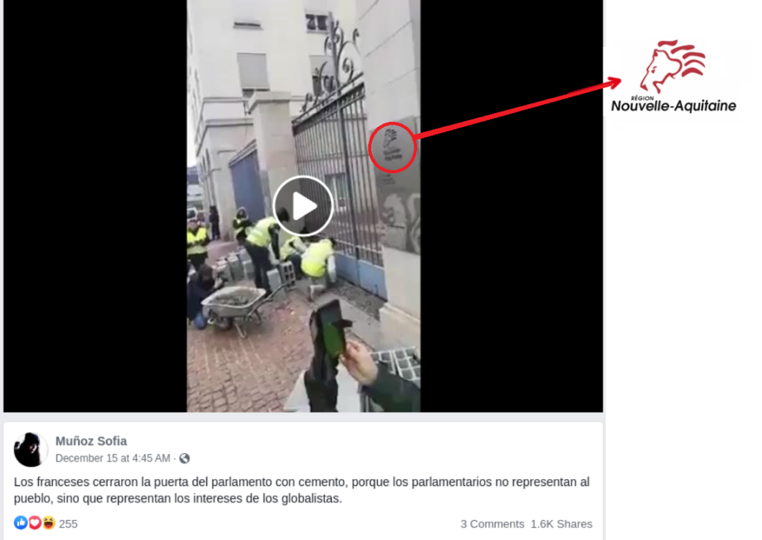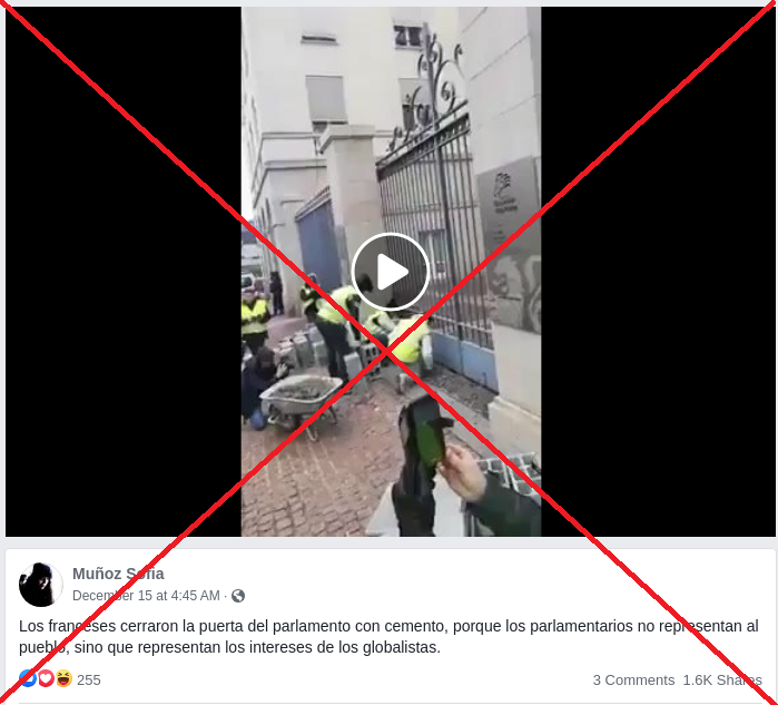 Los franceses cerraron la puerta del parlamento con cemento, porque los parlamentarios no representan al pueblo, sino que representan los intereses de los globalistas”, señala una de las publicaciones en Facebook (1, 2, 3) que comparten el video de una protesta en la que varias personas colocan bloques de cemento para obstruir la puerta de un edificio.