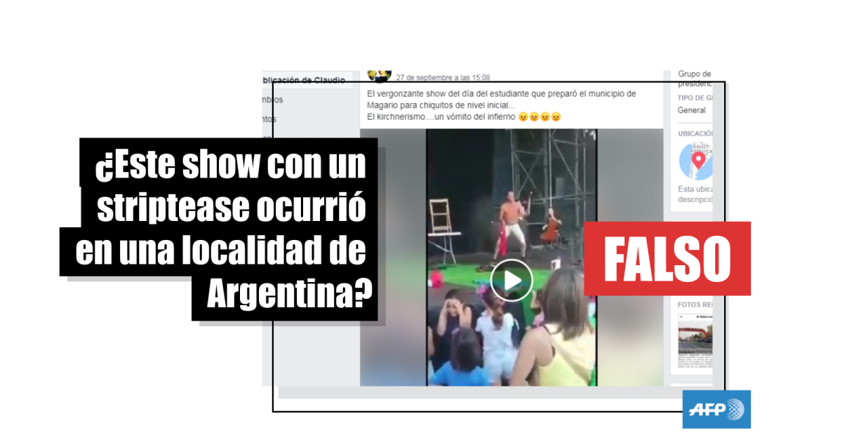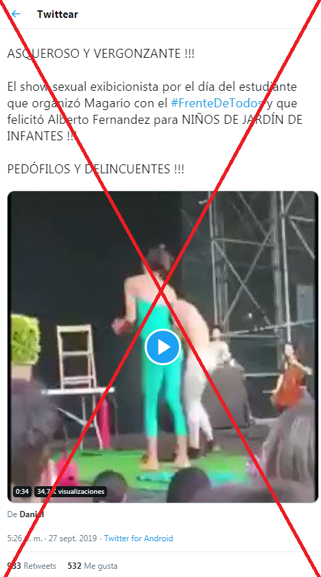 “El vergonzante show del día del estudiante que preparó el municipio de Magario para chiquitos de nivel inicial...El kirchnerismo....un vómito del infierno” (sic), dice la entrada, que fue compartida más de 5.600 veces en Facebook (1, 2) y retuiteada más de 1.400 veces en Twitter (1, 2), en referencia a la intendenta de la localidad de La Matanza, Verónica Magario, y candidata a vicegobernadora de la provincia de Buenos Aires por la alianza opositora Frente de Todos.