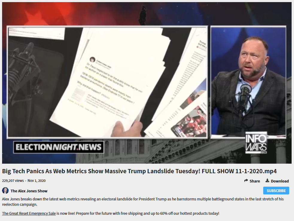 Una búsqueda dentro del sitio mencionado en la captura de pantalla, electionnight.news, una iniciativa de InfoWars para cubrir las elecciones en Estados Unidos, demostró que aquella corresponde a una emisión del 1 de noviembre pasado de casi una hora y media de duración, en la que Jones aseguraba que Trump sería reelegido y que los demócratas cometerían fraude.