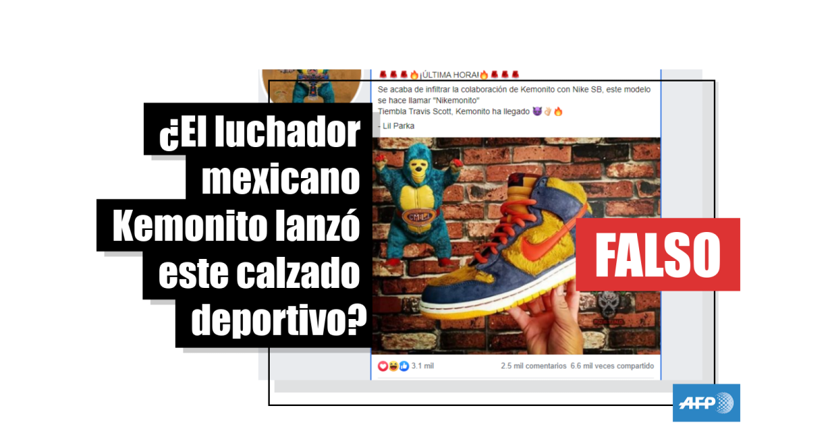 “Se acaba de infiltrar la colaboración de Kemonito con Nike SB, este modelo se hace llamar ‘Nikemonito’ Tiembla Travis Scott, Kemonito ha llegado”, dice una publicación compartida más de 6.000 veces en Facebook desde el 26 de febrero pasado que muestra un zapato deportivo de la marca Nike con los colores amarillo y azul, hechos de peluche, similar al luchador Kemonito.