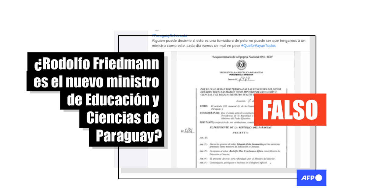 El 10 de marzo, Abdo tomó juramento al nuevo ministro de Educación y Ciencias, pero el elegido para reemplazar a Petta San Martín no fue Rodolfo Max Friedmann Alfaro, como aseguran las publicaciones virales, sino Juan Manuel Brunetti.