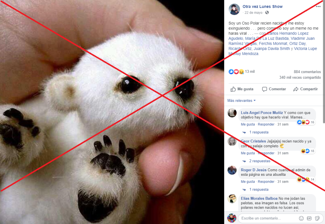 “Soy un Oso Polar recien nacido y me estoy extinguiendo… pero como no soy un meme no me haras viral…”, señala una de las publicaciones con la imagen que han sido compartidas más de 650.000 veces en Facebook y Twitter desde hace años.