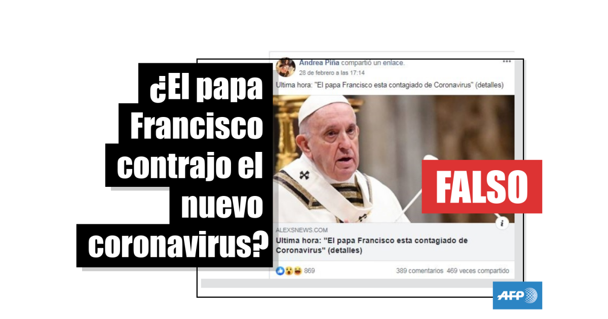 “Ultima hora: ‘El papa Francisco está contagiado de Coronavirus’”, titula un artículo que se comparte en redes sociales desde el 28 de febrero pasado. Según la herramienta CrowdTangle, la publicación ha generado más de 5.000 interacciones entre publicaciones en Facebook (1, 2, 3) y Twitter (1, 2), incluso a través de una falsa página de la cadena estadounidense CNN. También se recibió una consulta a través del WhatsApp de AFP Factual.