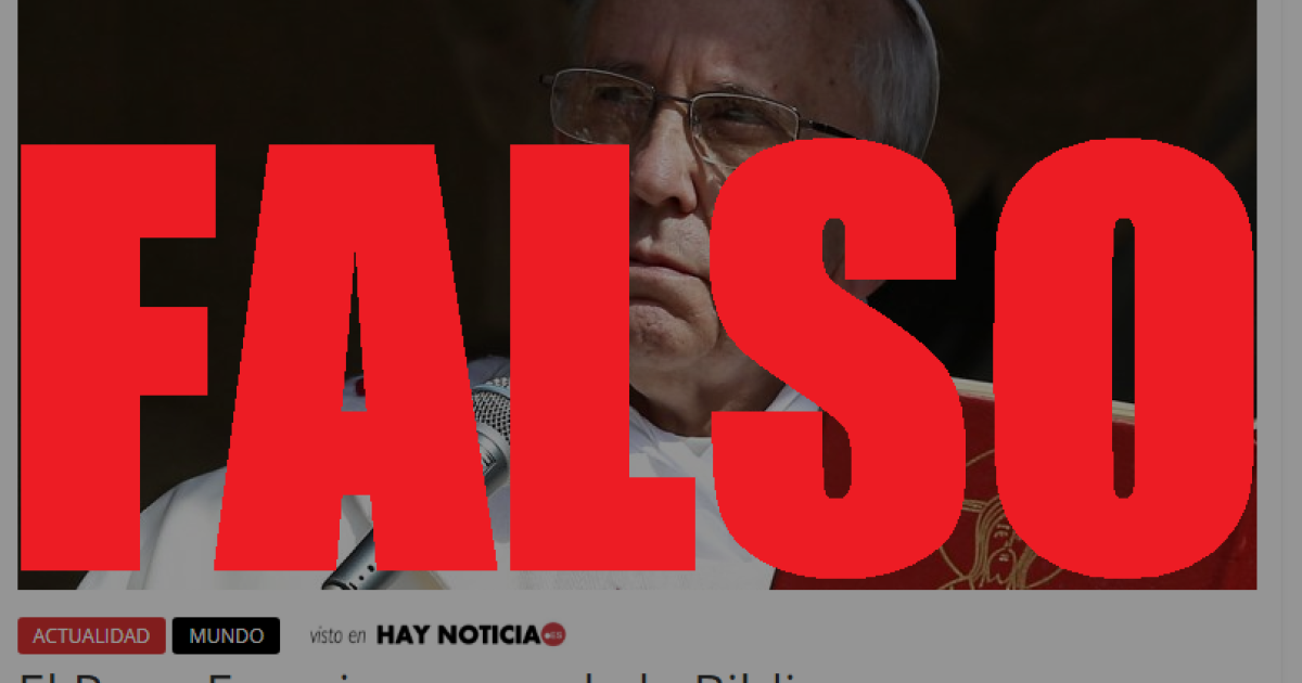 Sin embargo, el portal Hay Noticia le atribuye al papa una declaración en la que el pontífice asegura que “no podemos seguir intentando dirigir los pasos de nuestros feligreses en un mundo totalmente nuevo con un libro de hace miles de años”. Por lo anterior, propone “reescribir la palabra de Dios, aunque solo sea el Antiguo Testamento, en el que hay ciertos pasajes que es mejor no repetir”, dice la frase textual adjudicada falsamente al jerarca católico.