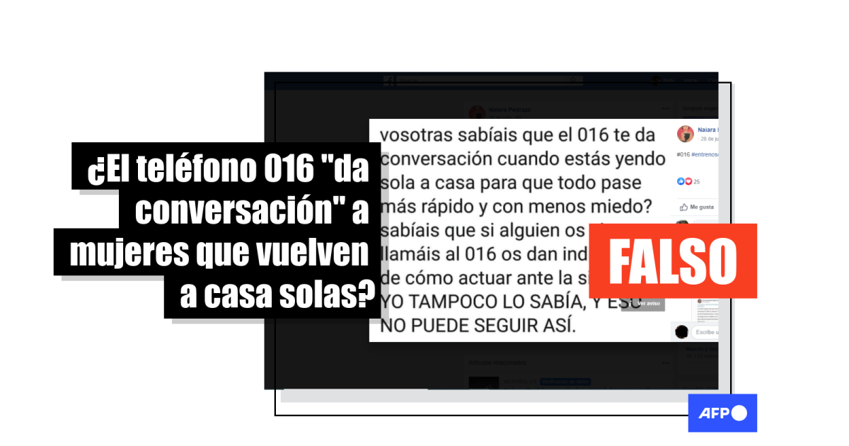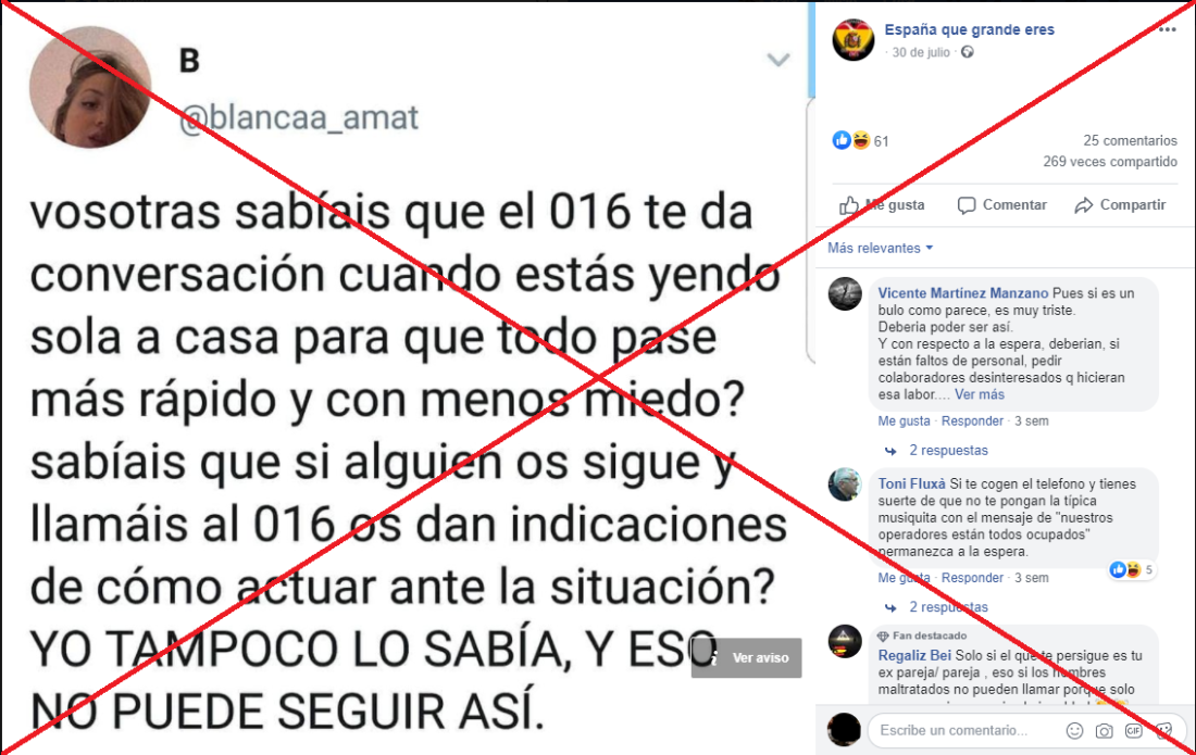 “Vosotras sabíais que el 016 te da conversación cuando estás yendo sola a casa para que todo pase más rápido y con menos miedo?”, comienza el texto que se ha difundido de manera muy similar en Facebook (1) y Twitter. Y continúa: “Sabíais que si alguien os sigue y llamáis al 016 os dan indicaciones de cómo actuar?”.