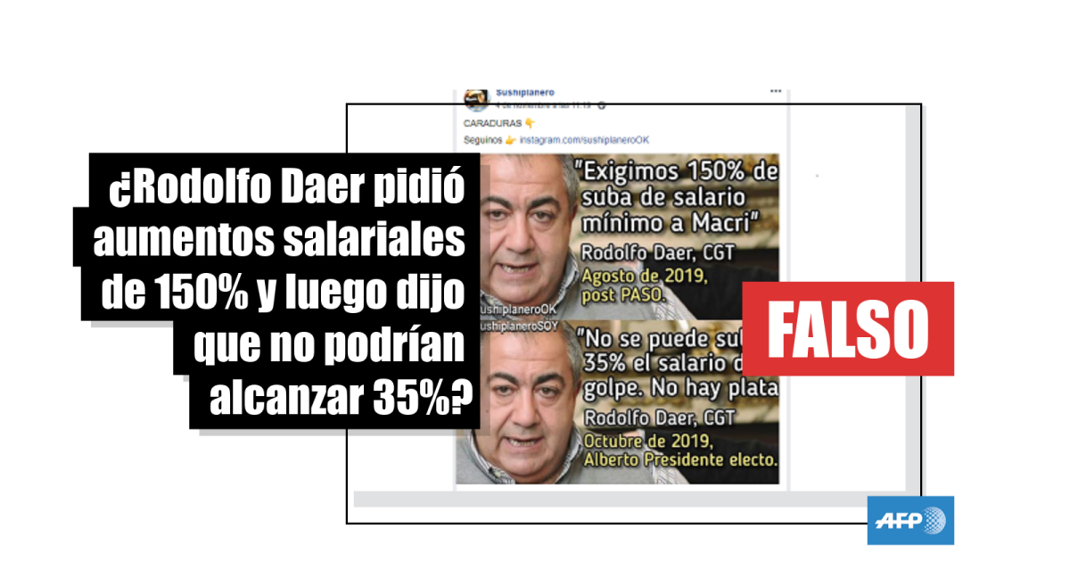 “‘Exigimos 150% de suba de salario mínimo a Macri’. Rodolfo Daer, CGT [Confederación General del Trabajo]. Agosto de 2019, post PASO [Primarias Abiertas Simultáneas y Obligatorias]”, dice la primera cita. La segunda indica: “‘No se puede subir 35% el salario de golpe. No hay plata’. Rodolfo Daer, CGT. Octubre de 2019, Alberto Presidente electo”. La publicación circula en Facebook (1, 2, 3) y en Twitter.