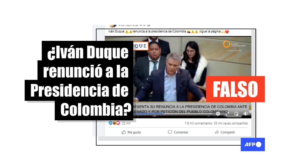 “Iván Duque renuncia a la presidencia de Colombia”, se lee en una publicación que ha sido compartida ampliamente en Facebook, junto a un un video de 30 segundos en el que se ve al mandatario diciendo: “Yo quiero una Colombia donde lo que triunfe sea el deseo de los ciudadanos de prosperar. Por eso quiero presentarle a usted, señor presidente, y a este cuerpo, mi renuncia presidencial”.
