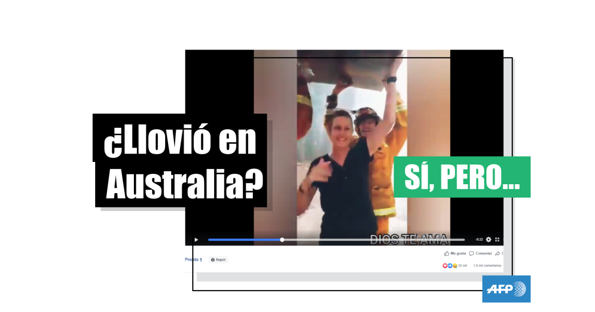 “La lluvia de la esperanza en Australia. Incluso contra los pronósticos de cero lluvias. Esto nos alegra a todos y todas”, afirma una publicación en Facebook del 4 de enero de 2020, en la que se muestra un video de un grupo de bomberos que festejan mientras llueve en una zona notoriamente afectada por el fuego. Las imágenes fueron reproducidas más de un 1,7 millones de veces y la publicación fue compartida más de 62.000 veces.