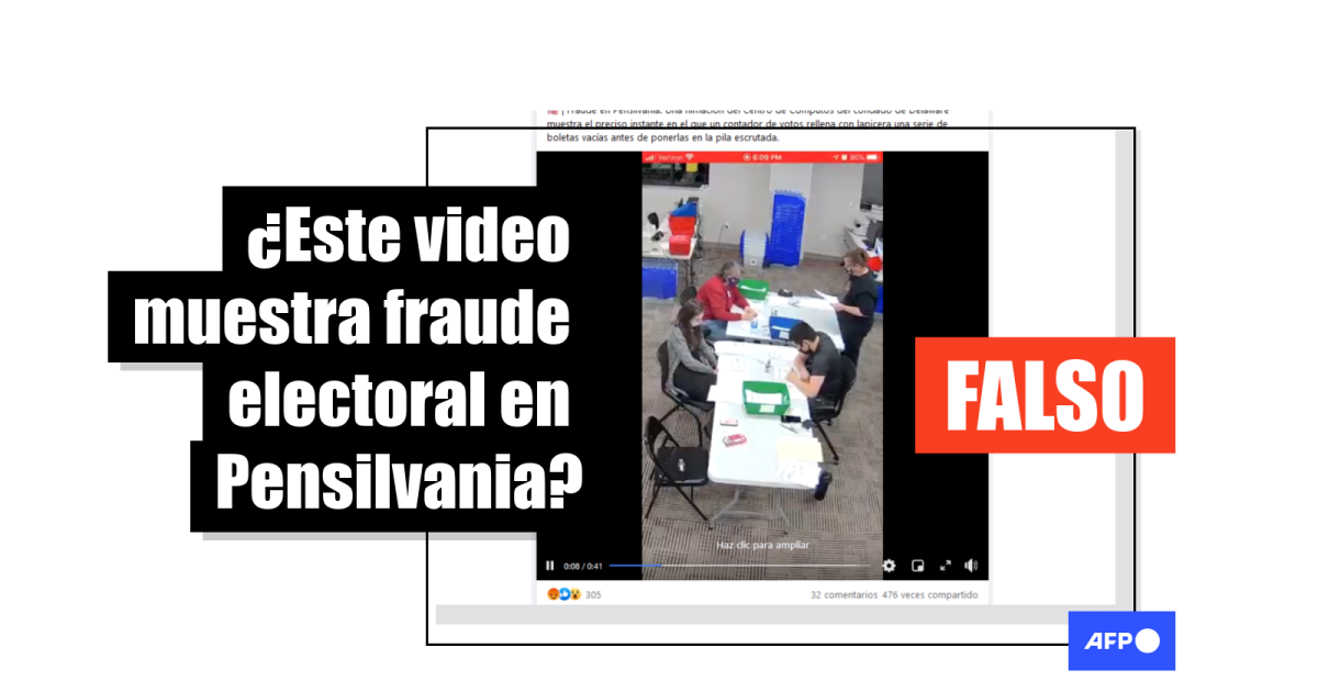 “Fraude en Pensilvania”, anuncian publicaciones en Facebook (1, 2) “Una filmación del Centro de Cómputos del condado de Delaware muestra el preciso instante en el que un contador de votos rellena con lapicera una serie de boletas vacías antes de ponerlas en la pila escrutada”.