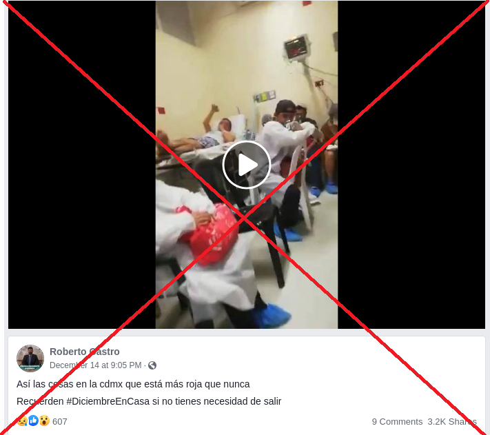 “Así las cosas en la cdmx que está más roja que nunca. Recuerden #DiciembreEnCasa si no tienes necesidad de salir”, señala una de las publicaciones en Facebook (1, 2) y en Twitter que incluye un video de varias personas en un hospital compartiendo el mismo cuarto, otras sentadas a lo largo de los pasillos y recostadas en el suelo.