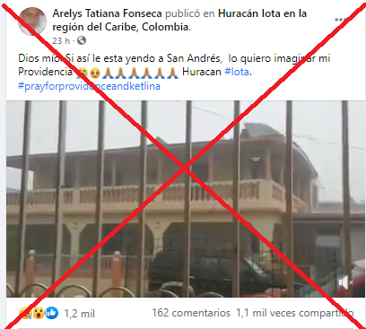 “Dios mío. Si así le esta yendo a San Andrés, lo [no] quiero imaginar mi Providencia Huracan #Iota. #prayforprovidenceandketlina”, dice una de las publicaciones compartidas en Facebook (1, 2, 3) y Twitter (1) en referencia al paso del huracán Iota el 16 de noviembre por el archipiélago que congrega las islas de San Andrés, Providencia y Santa Catalina al norte del territorio continental de Colombia.