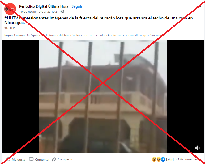 “Impresionantes imágenes de la fuerza del huracán Iota que arranca el techo de una casa en Nicaragua”, dice una de las publicaciones en Facebook (1, 2, 3, 4), replicadas también en Twitter luego de que Iota ingresara al Caribe norte de Nicaragua como un huracán de categoría máxima. A su paso dejó al menos 18 muertos en el país y arrancó árboles y techos de viviendas precarias.